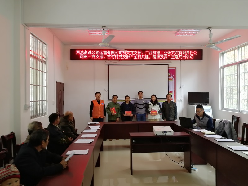 為激發(fā)支部黨建工作新活力,錘煉提升企業(yè)黨員黨性修養(yǎng),強化黨建引領(lǐng),助力脫貧攻堅,推動黨建工作與扶貧工作相互促進。11月28日,廣西機械工業(yè)研究院有限責任公司第一黨支部前往大化縣扶貧點七百弄鄉(xiāng)古竹村,與河池高速公路運營有限公司機關(guān)黨支部、古竹村黨支部聯(lián)合開展“企村共建,精準扶貧”主題黨日活動。