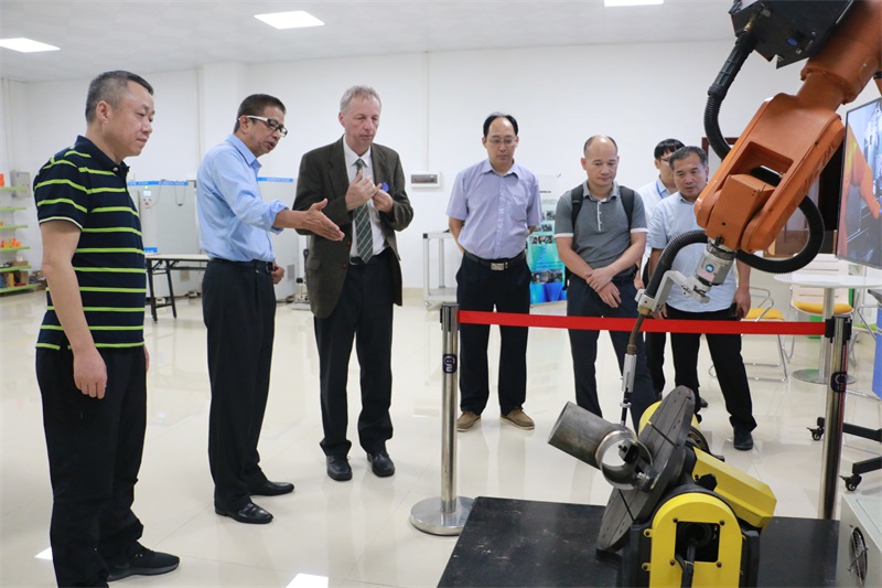 圖為匈牙利方參觀我院的工業(yè)機(jī)器人實驗室