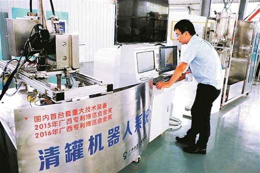 打造首臺套高壓清洗機器人。2014年底,高壓清洗機器人系統(tǒng)在廣西上上糖業(yè)有限公司正式投入榨季運行,標志著高壓清洗機器人系統(tǒng)研發(fā)成果順利實現(xiàn)產(chǎn)業(yè)化推廣。該系統(tǒng)是完全自主研發(fā),共獲21項專利(其中發(fā)明專利5項),獲廣西專利博覽會金獎專利2項,并于2015年獲得自治區(qū)工信委國內(nèi)首臺(套)重大技術(shù)裝備認定,2018年獲得廣西創(chuàng)新發(fā)展驅(qū)動(重大)專項支持。高壓清洗機器人系統(tǒng)是面向國內(nèi)外制糖、輕工、食品、化工、制藥等行業(yè),在狹小受限空間、高溫潮濕環(huán)境下,代替人工清洗加熱管機構(gòu)的機器人,屬世界首創(chuàng),達到代替?zhèn)鹘y(tǒng)人工作業(yè)方式、減少人員傷亡、提高安全生產(chǎn)率和提升清洗質(zhì)量的效果。目前,該系統(tǒng)已在廣西、云南、新疆等主要制糖產(chǎn)區(qū)企業(yè)大量應用,并出口泰國、越南、緬甸等國家,受到海外客戶高度認可,打造了廣西制糖智能裝備的優(yōu)質(zhì)品牌。