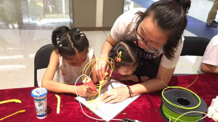 “3D·啟智·童(同)樂”展區(qū)主要結(jié)合“六一”主題和三祺廣場“新教育”的區(qū)位優(yōu)勢,開展面向兒童的3D打印科普親子體驗(yàn)活動(dòng)。無論是3D打印筆區(qū)域、3D打印機(jī)區(qū)域都內(nèi)容豐富,過程有趣,吸引了絡(luò)繹不絕的人群圍觀,尤其是3D打印煎餅和巧克力成了大家的注腳點(diǎn),邊看邊嘖嘖稱奇。孩子們可以體驗(yàn)DIY美食的樂趣,可以實(shí)現(xiàn)畫出立體的圖畫,傳遞了科普的知識性、實(shí)用性和趣味性,大人和小孩樂在其中,從而激發(fā)了孩子們愛思考、樂創(chuàng)造、勤動(dòng)手等的良好品質(zhì)。