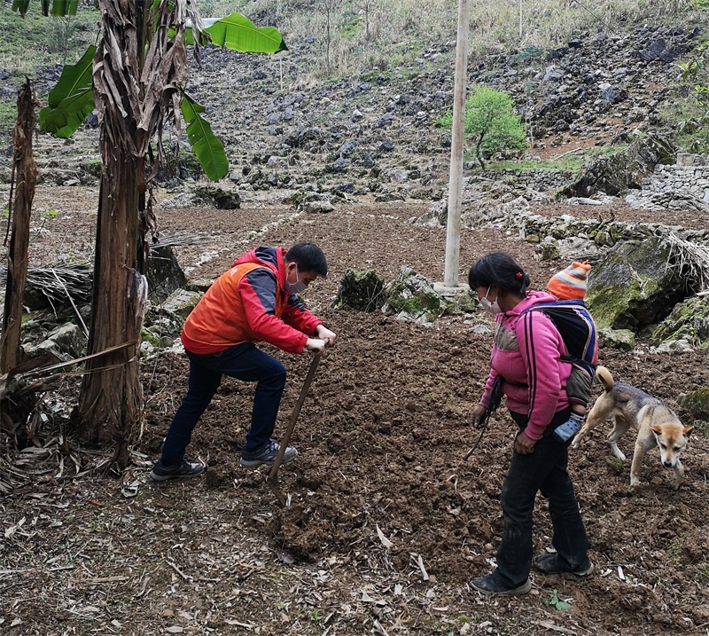 古竹村今年的旱季比往年來得要長些,一場春雨來到,覃敢再次忙碌起來,他組織工作隊入戶宣傳春耕春種知識和把握季節(jié)的重要性和緊迫性?!敖衲甏焊r(nóng)用物資準備得怎么樣了?種子、肥料購買了嗎?”了解到由于各村和鄉(xiāng)鎮(zhèn)街道實施封閉式管理,縣內(nèi)所有運營車輛停運,村民外出購買春耕農(nóng)用物資有困難。覃敢與村委、工作隊員們商議并多方打聽,了解到除了臨近的都安縣因疫情較嚴重暫時無法通行外,村民們可憑健康證明到大化縣城和隔壁鄉(xiāng)鎮(zhèn)街道購買農(nóng)用物資。覃敢組織人員在村口設卡處把關協(xié)調,對外來運送種子、化肥、農(nóng)藥等農(nóng)耕物資的人員嚴格檢測,無可疑現(xiàn)象的為其開具健康證明,保證物資車輛順利通行,打通村民們購買農(nóng)用物資的“綠色通道”。