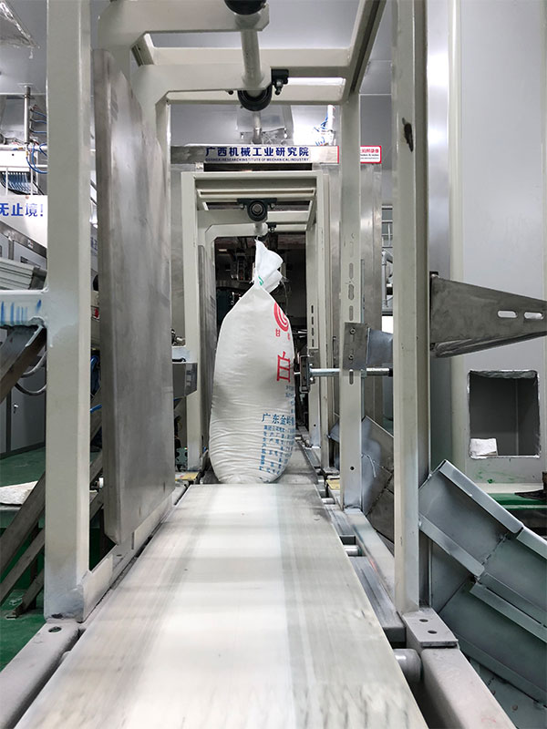 糖廠使用套裝式內(nèi)外袋全自動包裝碼垛機器人生產(chǎn)線現(xiàn)場