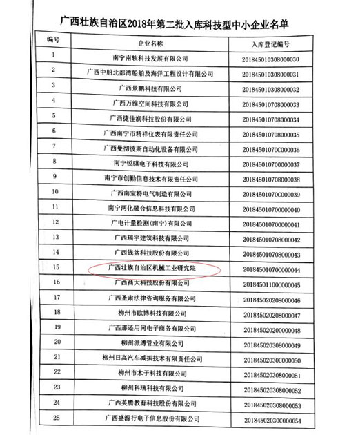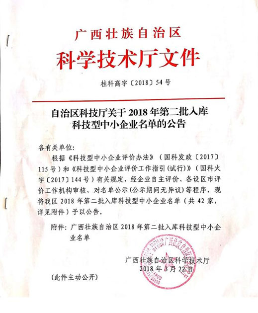 近日,廣西科技廳公告了2018年第二批入庫(kù)科技型中小企業(yè)的名單,我院入庫(kù)該名單之列。