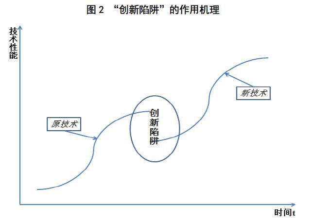 “創(chuàng)新陷阱”正是產(chǎn)生于這種新舊技術(shù)的更替過(guò)程中(參見(jiàn)圖2)。具體來(lái)說(shuō),對(duì)于一家企業(yè),從原有技術(shù)軌道跨向新技術(shù)軌道是一件不容易的事情;企業(yè)越是在自己原有的技術(shù)專長(zhǎng)上加以創(chuàng)新,便會(huì)在原有技術(shù)軌道上走得越遠(yuǎn);也正因?yàn)槿绱?,企業(yè)也便越會(huì)延滯進(jìn)入新的技術(shù)軌道,進(jìn)而也越來(lái)越遭受舊技術(shù)極限的扼制。