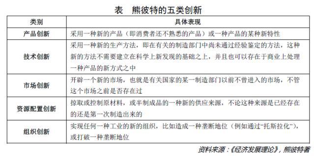 在熊彼特看來(lái),創(chuàng)新包括五種情況,分別為產(chǎn)品創(chuàng)新、技術(shù)創(chuàng)新、市場(chǎng)創(chuàng)新、資源配置創(chuàng)新與組織創(chuàng)新,具體如下表: